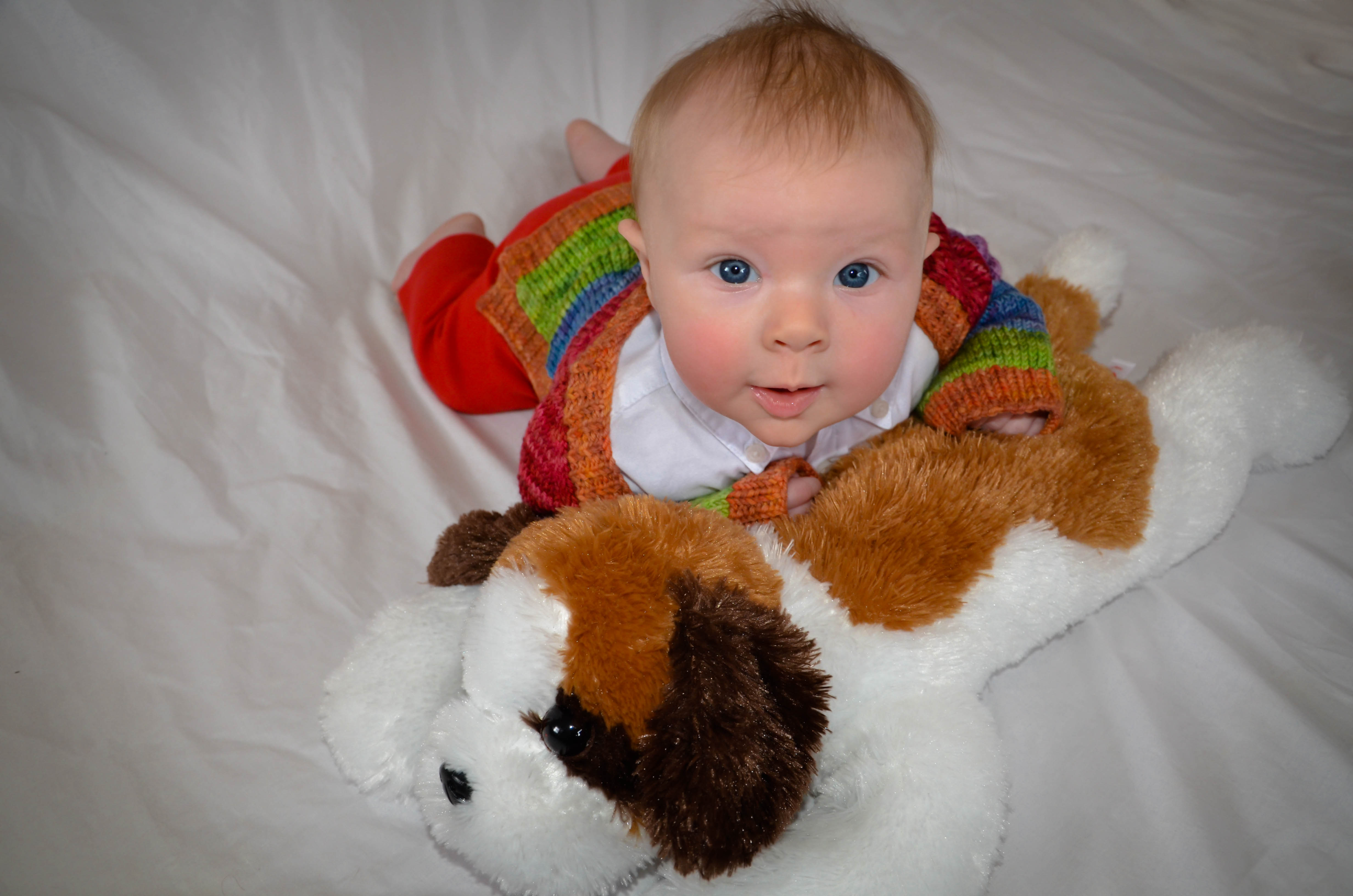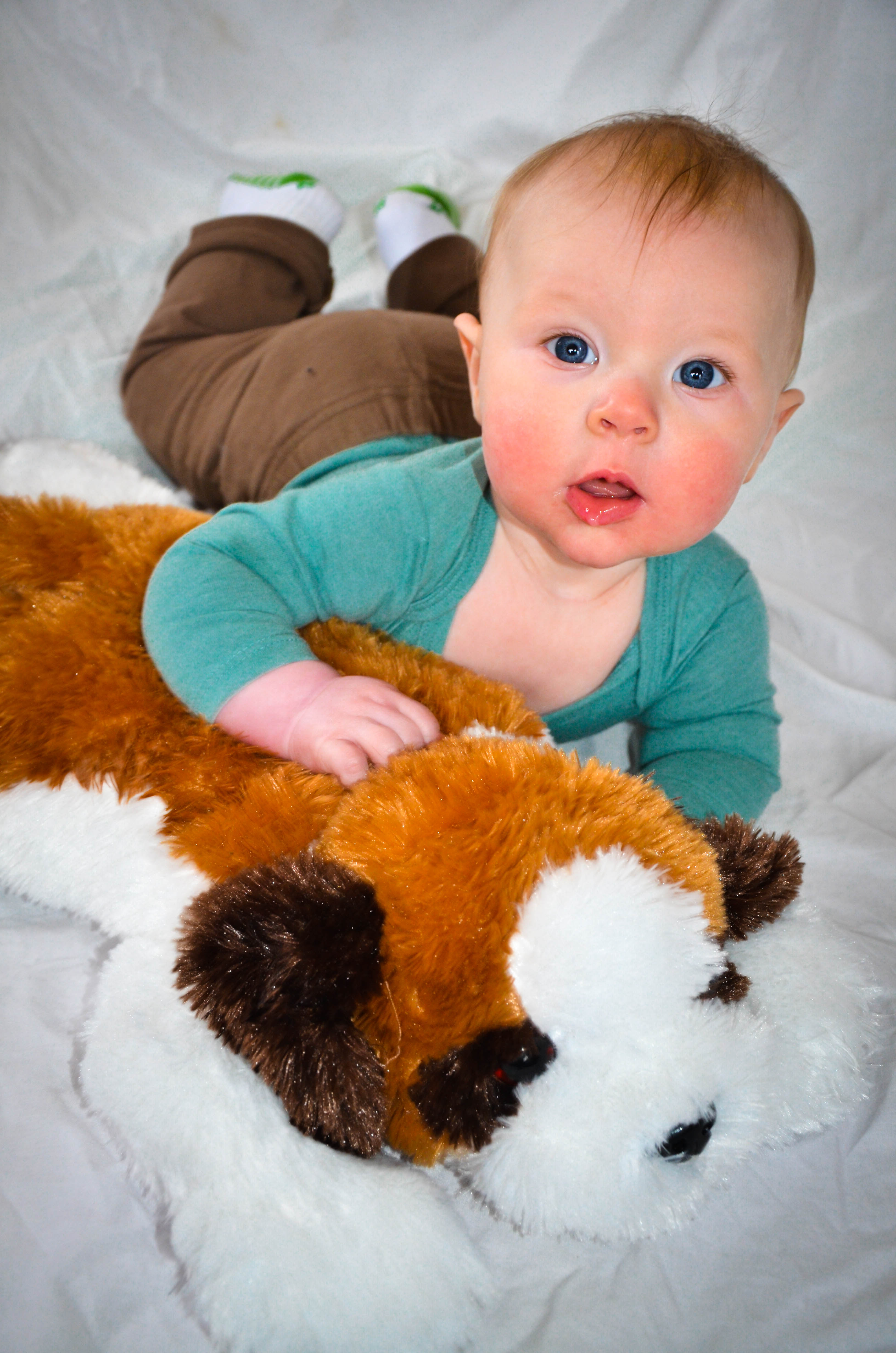 I also set up a cake smash background using a white cloth and some tissue paper pom poms in rainbow colors. I dressed him in a green cloth diaper, put a party hat on and let him at the apple smash cake I had baked!